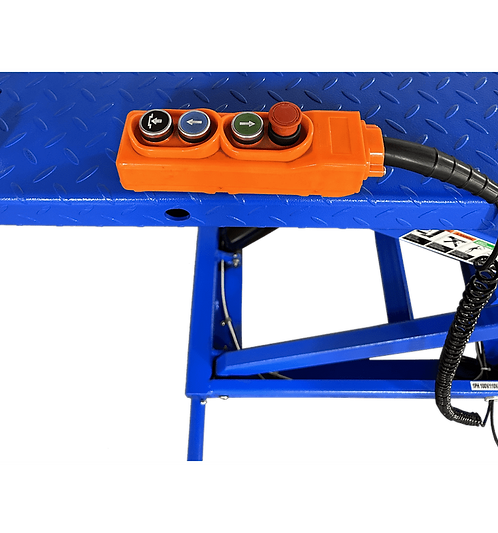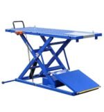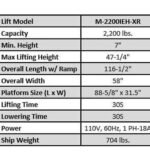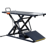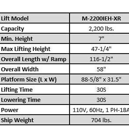 Description The M-2200IEH-XR Motorcycle lift features our innovative retractable approach ramp system which automatically retracts the approach ramp from the work space while the lift is rising. A spring loaded drop down panel for improved rear wheel service access is integrated into the table. The drop down panel swings out of the way and quickly clips back into place when not in use. We have maintained our hand held pendant for complete operation. No need to put hands or feet in harms way when disengaging safety latches. Vise and Chock sold separately. Features ELECTRIC / HYDRAULIC MOTORCYCLE LIFT BENCH EXCLUSIVE FULL WIDTH RETRACTABLE RAMP SYSTEM 2,200 LBS. CAPACITY 47″ RISE HEIGHT 5″ X 88.6″ PLATFORM SIZE HAND HELD REMOTE CONTROL PENDANT 110V INTEGRATED ELECTRIC / HYDRAULIC POWER UNIT MAGNETIC LOCK RELEASE SIX LOCKING POSITIONS REAR DROP DOWN SERVICE PANEL STABILIZER BAR WHEEL STOP TIE-DOWN ANCHOR EYE BOLTS PLATFORM DESIGNED TO MOUNT OPTIONAL M-VISE OR M-CHOCK Specifications Lift Model M-2200IEH-XR Capacity 2,200 lbs Min. Height 7″ Max Lifting Height 47-1/4″ Overall Length w/ Ramp 116-1/2″ Overall Width 58″ Platform Size (L x W) 88-5/8″ x 31.5″ Lifting Time 30S Lowering Time 30S Power 110V, 60Hz, 1 PH-18A Ship Weight 704 lbs